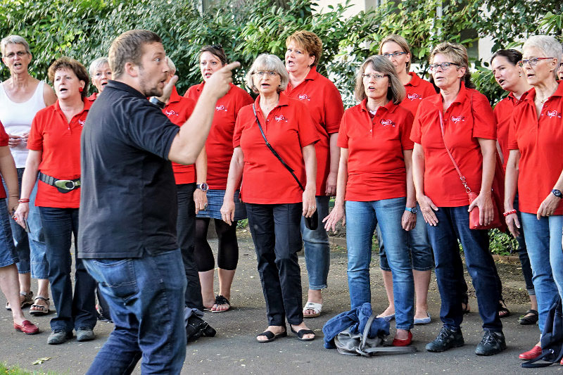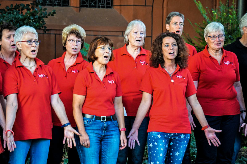 Ergriffen lauschen rund 300 Besucher auf dem Karmeliterplatz den mitreißenden Klängen von Bond-Titellied „Skyfall“. Es klingt gewaltig, wenn alle 30 Sänger und Sängerinnen für den Refrain ihre Stimmen zum Crescendo anschwellen lassen, die Akustik zu Füßen der Ruine von St. Christoph ist phantastisch. Eine ältere Dame ist völlig aus dem Häuschen: „Die sind richtig gut!“, schwärmt sie.